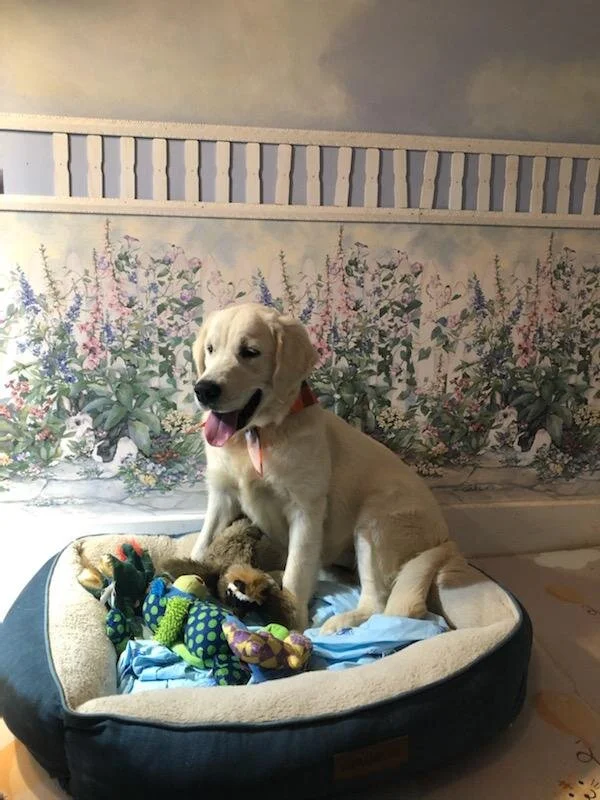 This beautiful boy is River (Asher) from Pine Acre Puppy. Heโll be two in October. He has brought nothing but joy to our hearts, and anyone that meets him. He was chipped, up on all his vaccines, and almost completely housebroken at eight weeks old. He continues to amaze us with how gentle he is, considering his size. He also doesnโt realize heโs too big to be a lap dog (that doesnโt stop him from jumping on our laps). My brother has a dog from another litter, two weeks older than ours. He will tell you the same about his dog. These our are first Golden Retrievers. Their love is endless. Their antics are so cute.